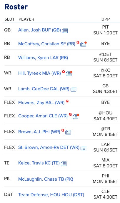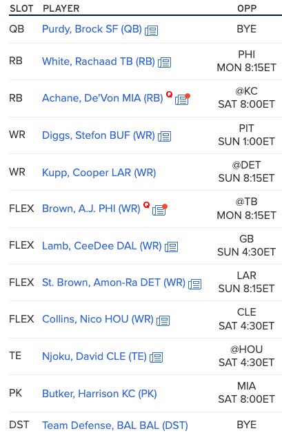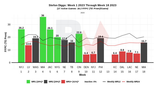 Diggs - WR9 - Started the year super hot with 5 100+yard games in the first 6 weeks and 5 total TDs and hasn’t had a 100 yard games since…scoring only 3 more TDs over the last 13 games. Not the trend we want to see….we like to see players ramping up not winding down BUT this is the playoffs and Diggs is their top skill position player, despite James Cook coming on late.