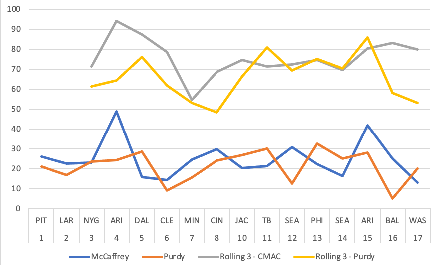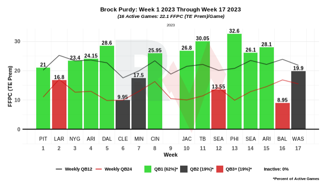 Brock - 49ers go to the Super Bowl, Purdy (avg. 22 FPPG) outscores McCaffrey (24.6 FPPG)….See below this isn’t an insane take. Purdy essentially did just that over the back-half of the year. Purdy could also just outscore or outlast Lamar & Allen, the other most owned QBs.